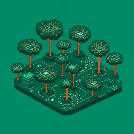 A close-up view presents a circuit board adorned with miniature trees. These vibrant trees, some illuminated, contrast against the dark electronic components. The composition suggests an integration of nature and technology. This image could be suitable for illustrating concepts of innovation or environmental responsibility.