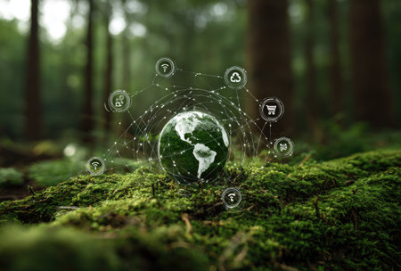 A close-up view presents a green-covered globe encompassed by several interconnected digital icons. The image is set in a natural, green-dominated environment possibly a forest, with blurred background trees. The composition utilizes soft lighting, suggesting an outdoors, daytime setting. It can be used for conceptual illustrations in environmentalism or technology-related projects.