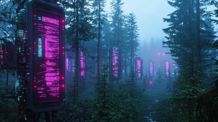 Vibrant neon panels illuminate a dense, misty forest. Trees surround the high-tech displays, creating a striking contrast between nature and technology during a foggy day.