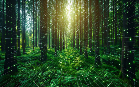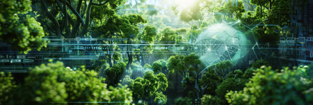 Futuristic digital forest concept with green technology and ecology network. Background for technological processes, science, presentations, education, etc
