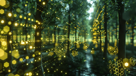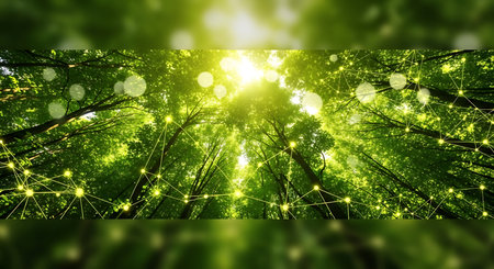 Looking up through lush green trees with sunlight filtering through. Yellow geometric network lines and nodes overlay the natural scene.