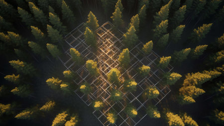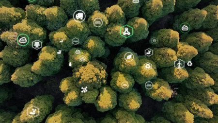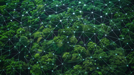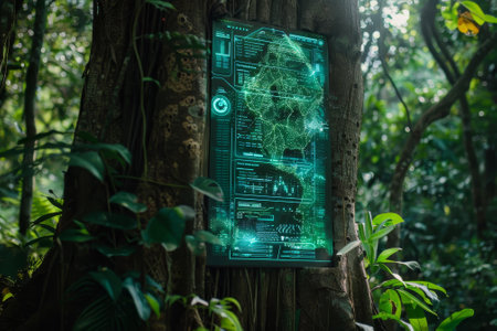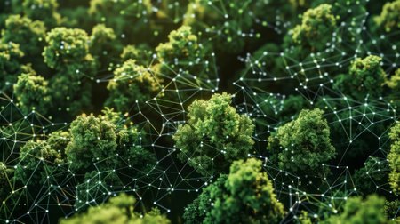 An aerial perspective showcases a vibrant green forest canopy, possibly signifying biodiversity and natural resources. Digital overlay elements, rendered in a translucent style, suggest technology integration. The image conveys a sense of environmental sustainability and modern data analysis for potential commercial uses related to ecology.