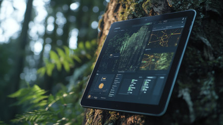 Tablet Displaying Forest Data Against A Tree Trunk Surrounded By Lush Greenery