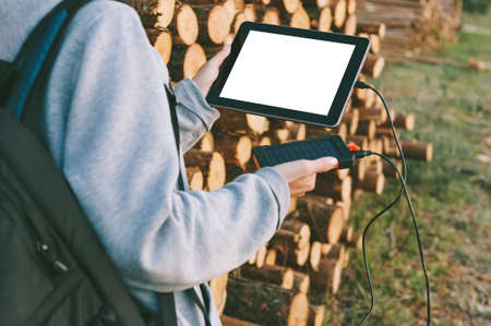 Mock-up of a tablet in the hands of a girl with a power bank charger. Against the background of folded timber, round wood