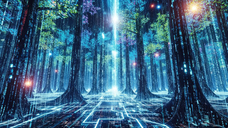 An illustration features a digital forest with vibrant, colorful trees and interconnected data pathways. The artwork displays a bright, glowing light emanating from the center, highlighting a blend of nature and technology. This image could be used for various purposes, including articles about innovation, digital transformation, and futuristic concepts.