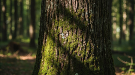 green moss on tree trunk in forest with sun rays and bokeh