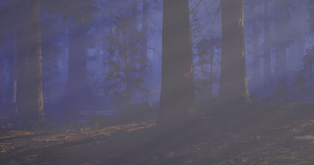 Sun rays passing through the trees in a forest with fog and sunlight