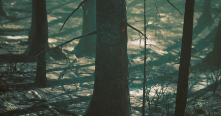 Sunbeams pierce through the dark trunks of a dense forest, casting long shadows and creating dramatic light rays on the forest floor.