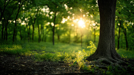 A stunning view of a majestic tree standing in a tranquil forest. Sunlight streams through vibrant green leaves, illuminating the mossy ground and creating an ethereal atmosphere.