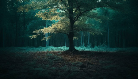 A single tree stands in a mysterious forest, bathed in a dreamy, teal light. The scene evokes a sense of peace and enchantment.
