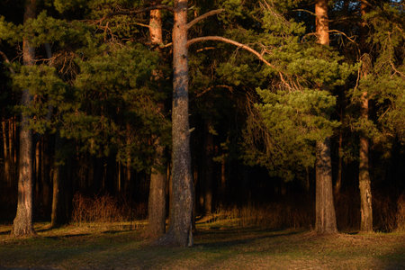 Landscape. Pine grove in the rays of the setting sun