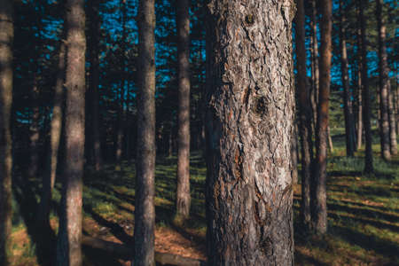 Close up of a tree trunk in a pine forest in springtime