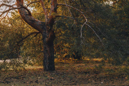 An ancient forest on a bright sunny day. Bright colors of the surrounding nature. Unique natural colors