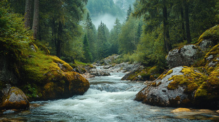 Serene summer landscape stream flowing through mossy stones and lush green forest trees