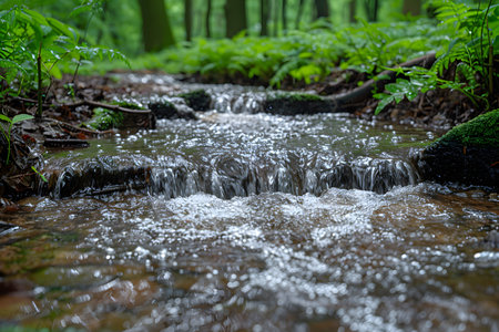 Serene forest stream gently flowing through lush green undergrowth, capturing the beauty of a tranquil woodland. crystal-clear water glistens over rocks and pebbles, framed by vibrant foliage, creating a peaceful, natural atmosphere ideal for nature photography. Generative AI