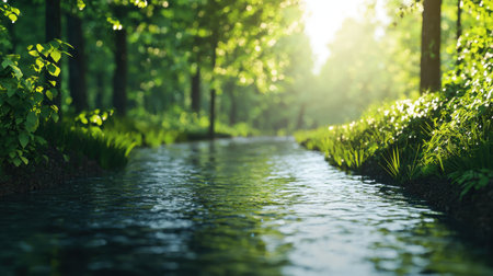 A tranquil stream flows through a dense forest, reflecting the surrounding trees and sunlight. The scene is dominated by shades of green and brown, with water creating a sense of movement. Suitable for environmental themes, it has commercial and editorial applications to illustrate nature.