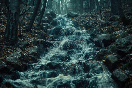 A tranquil stream flows gently through a vibrant autumn forest. Golden leaves and moss-covered rocks create a peaceful atmosphere, highlighting nature's beauty.