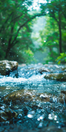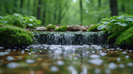 A serene view of a forest stream flowing over moss-covered rocks, surrounded by lush greenery. The gentle bubbles add to the tranquil atmosphere, inviting peace.
