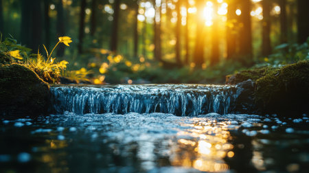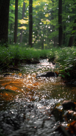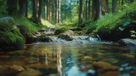 A serene stream flows through a vibrant forest, with clear water glistening and lush moss covering the rocks. Sunlight filters through the trees, creating a peaceful atmosphere.