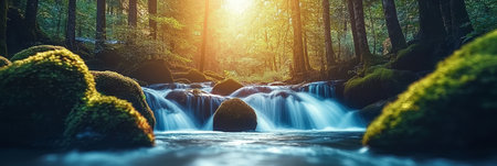 A peaceful forest scene with a flowing stream, moss-covered rocks, and sunlight filtering through tall trees, creating a tranquil and pristine environment perfect for nature lovers and outdoor enthusiasts. AI generated image
