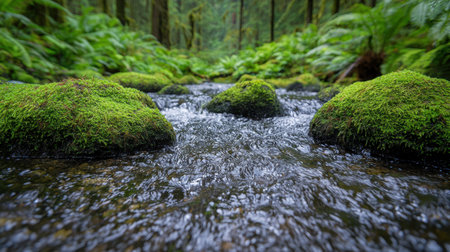 Lush green forest with mosscovered rocks and flowing creek under diffused daylight