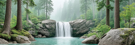 A powerful waterfall plunges into a rocky basin, framed by a dense forest of evergreen trees. The scene is enveloped in a soft mist, creating a serene and atmospheric ambiance. The composition features a natural color palette of greens, grays, and whites. This image can be used for various commercial or editorial applications.