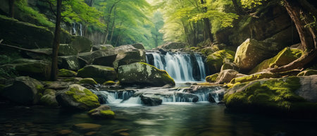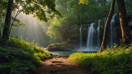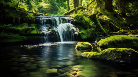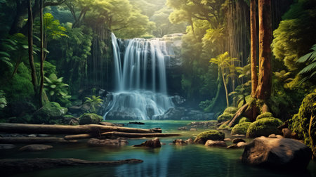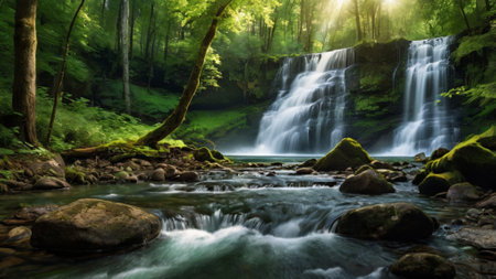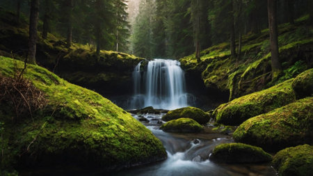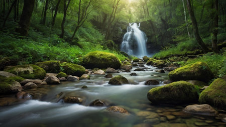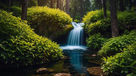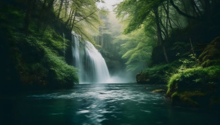 Serene waterfall in a mystical forest. Peaceful nature scene.