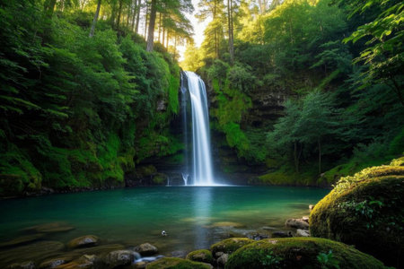 A powerful waterfall plunges into a serene pool, surrounded by dense evergreen trees. The composition highlights the lush green foliage and the cascading water, illuminated by sunlight. The scene suggests a natural, outdoor environment. Suitable for various uses, including editorial and commercial projects.