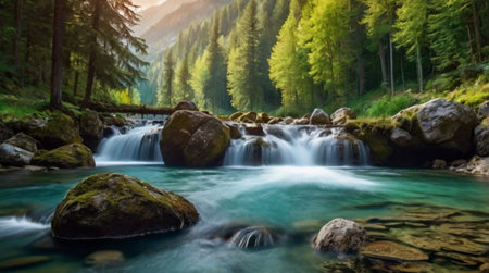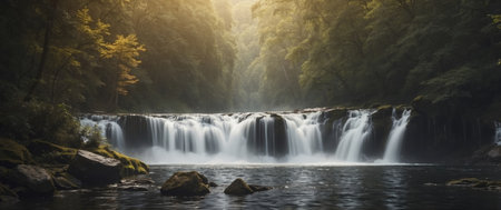 Picturesque Flow of Freshness Rocks Enfold a River Cascade Amidst the Forest with Morning Glow