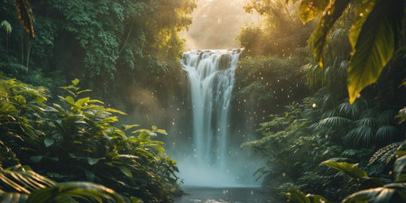 Discover a breathtaking scene of a lush tropical rainforest featuring a majestic waterfall that cascades through dense greenery, creating a peaceful oasis.