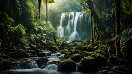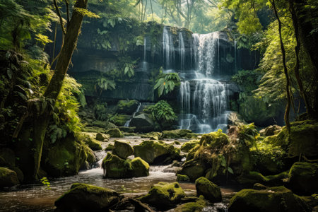 A stunning waterfall flows over moss-covered rocks within a vibrant green forest. The image showcases the dynamic movement of water contrasted by the stillness of the surrounding landscape. The scene, bathed in soft light, evokes a sense of tranquility. Suitable for various projects including environmental or travel-related content.