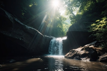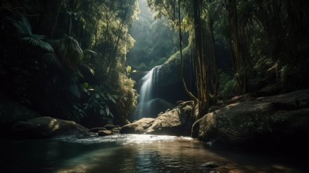 AI Generated. Serene waterfall cascading down rocky cliffs surrounded by lush greenery and soft sunlight filtering through