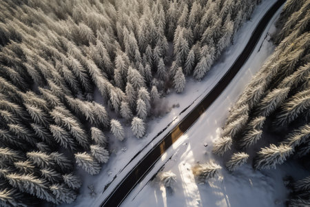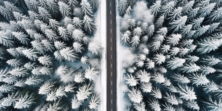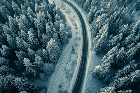 Aerial shot of a road winding through snow-covered forest creates a peaceful winter landscape Perfect for travel or holiday marketing materials.