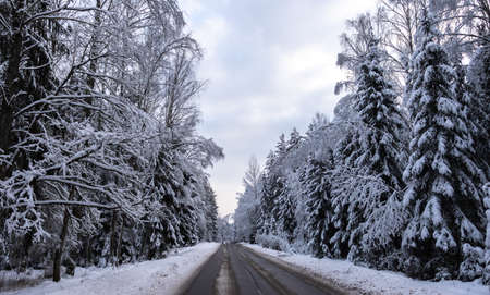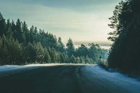 Winter landscape with a road leading into the dark snowy forest. Weather, transport, travel concept.