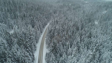 Aerial view of winter forest and road. Beautiful winter landscape.