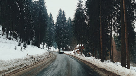 A captivating winter scene featuring a winding road flanked by towering pine trees dusted with snow, creating an enchanting atmosphere for travelers.