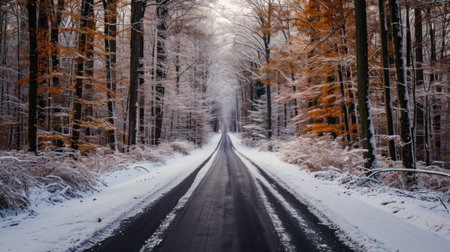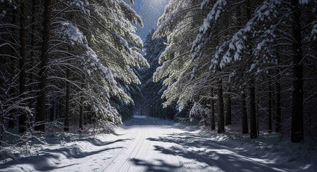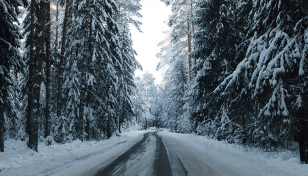 An image showcases a snow-covered road winding through a forest of tall evergreen trees blanketed in snow. The composition features a symmetrical arrangement, with a clear road leading to the horizon. Soft lighting creates a serene atmosphere, suitable for various editorial and commercial applications.