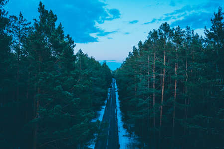 Winter forest and asphalt road. View from above. The photo was taken with a drone. Pine and spruce forest with a black road in the snow.