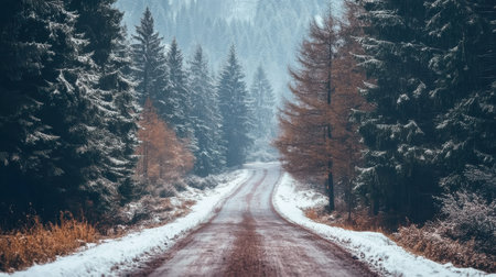 A winding road traverses a snowy landscape, flanked by dense, foggy forests, creating a captivating scene of winter serenity and natural beauty. Perfect for travel and nature themes.
