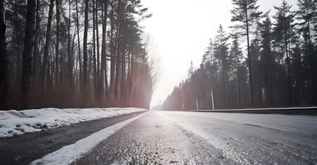 Generative AI, Misty winter fir forest beautiful landscape with road, in hipster vintage retro style, evergreen trees with show