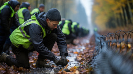 A group of workers building a fence in an autumn forest, showcasing teamwork and dedication. The image captures the essence of hard work and cooperation in a natural setting.