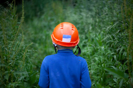 Child in a protective helmet. Construction helmet on the boy's head. The schoolboy leaves for the forest. Lost child in the forest. The tomboy goes for a walk. Safety precaution hard hat.