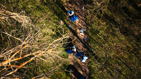Aerial view of campaigners joining forces to recycle and tidy up garbage in a forest in order to safeguard the ecosystem. Individuals having ecologic conservation principles, eco friendly.