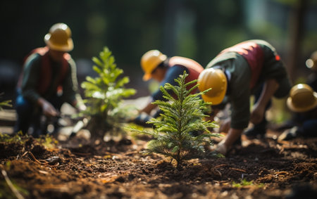 a group of volunteers planting trees to combat deforestation, with young saplings in the foreground