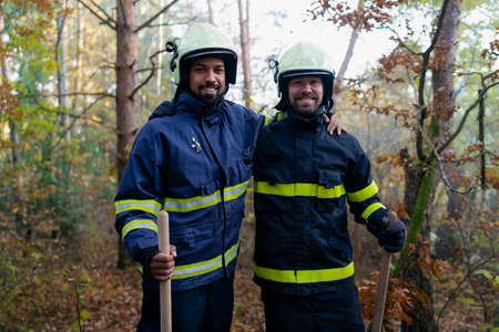 Happy firefighters men after action, stopping fire in forest and looking at camera.