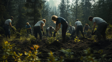 Dedicated Volunteers Working Together to Plant Young Trees in a Lush Forest Environment