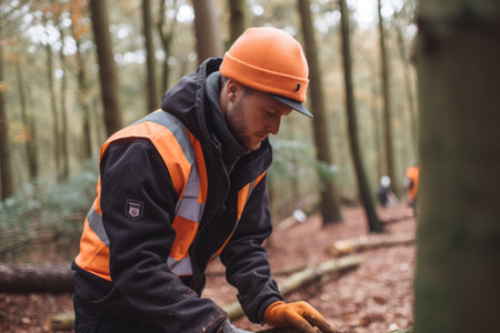Forest Worker Using Safety Gear During Timber Inspection in Remote Woodland