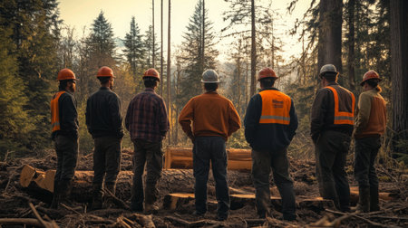 Diverse team of lumberjacks working with machinery in a misty forest