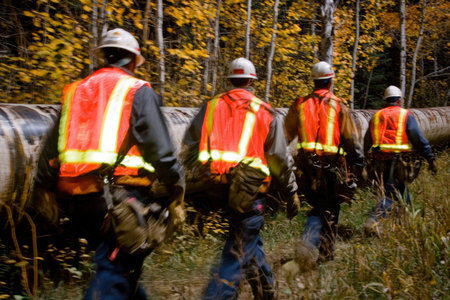 A group of workers in helmets and reflective vests walk along a pipeline in a wooded area, showcasing teamwork and safety in a construction setting.