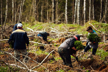 Workers are planting trees in the forest on a spring day.